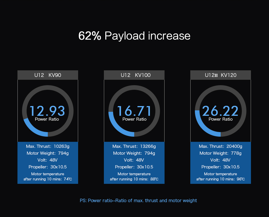 • %62 Yük Taşıma Artışı• Maksimum İtme: 20kg• Motor çalışma ömrü-1500 uçuş (40 dakika/uçuş)